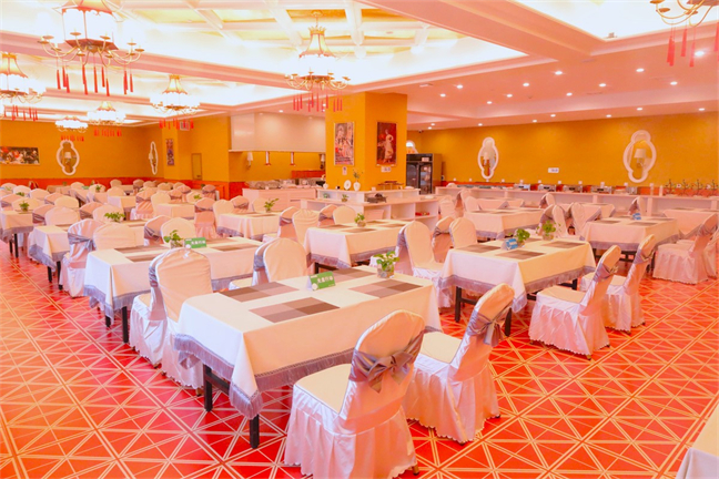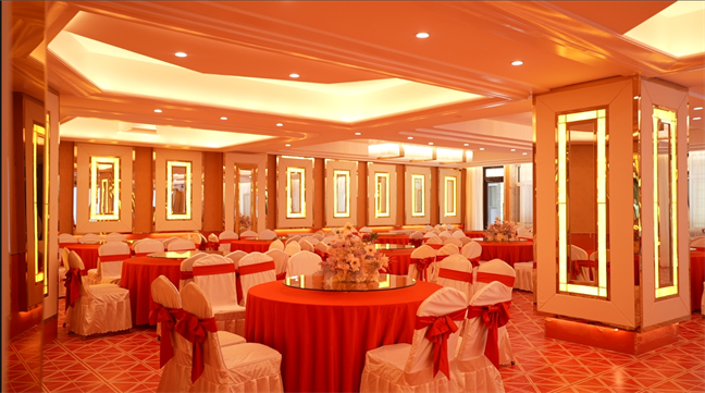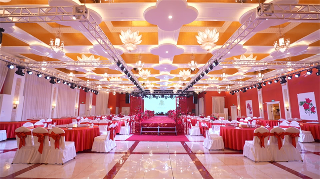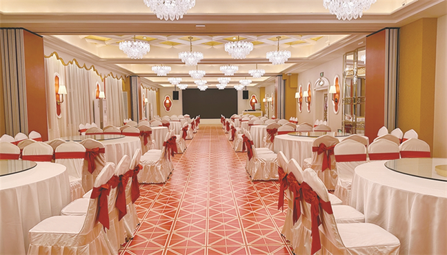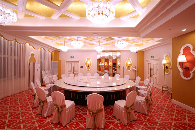 皇宮廳—金碧輝煌、皇宮式裝修,面積1038㎡,層高8.6米,配備愛情階梯、軌道威亞、二層觀禮臺、浪漫燈光秀、旋轉升降舞臺、頭頂天幕連接開合大屏??沙薪?0桌的大型宴會,也可舉辦600人的大型會議;還可用作會展、車展場地,每逢節假日還為市民上演文藝節目。